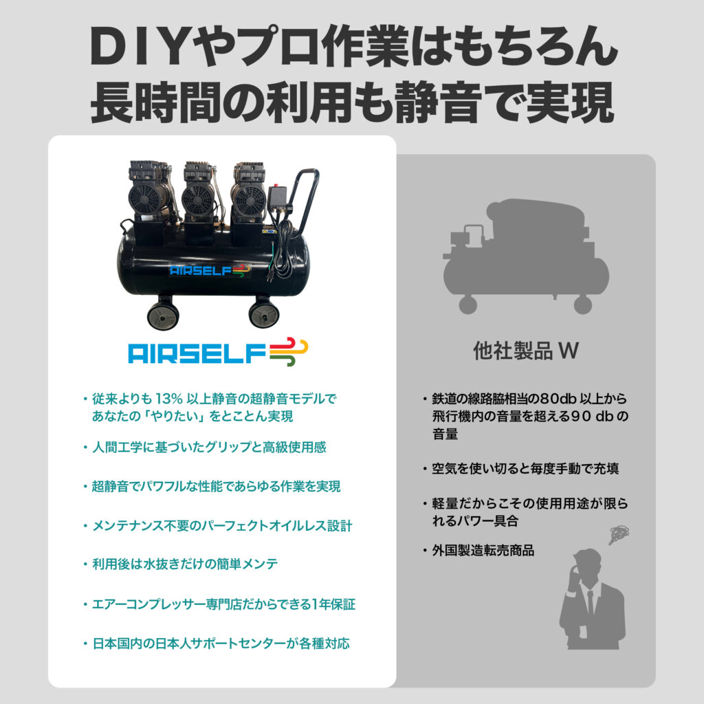 ※商品の性質上、静音仕様のエアーコンプレッサーで開発しておりますが完全無音ではございません。ご了承ください。