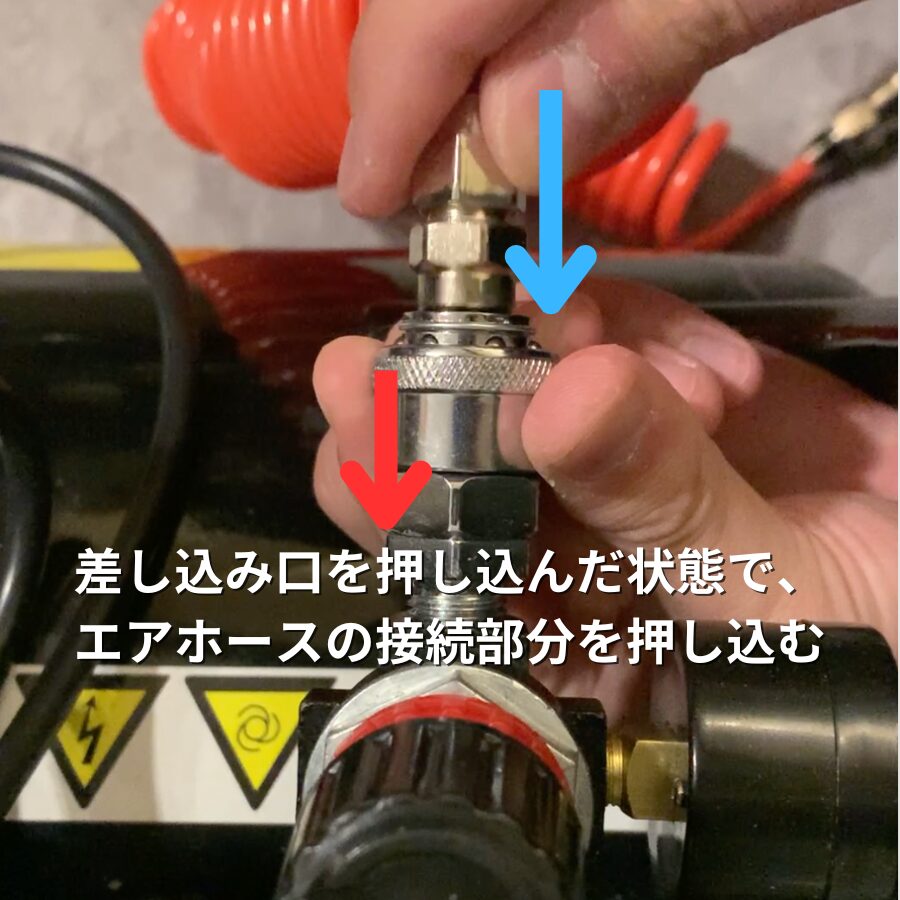 • カプラーを押し込んだ状態のまま、エアホースをしっかりと奥まで差し込みます。