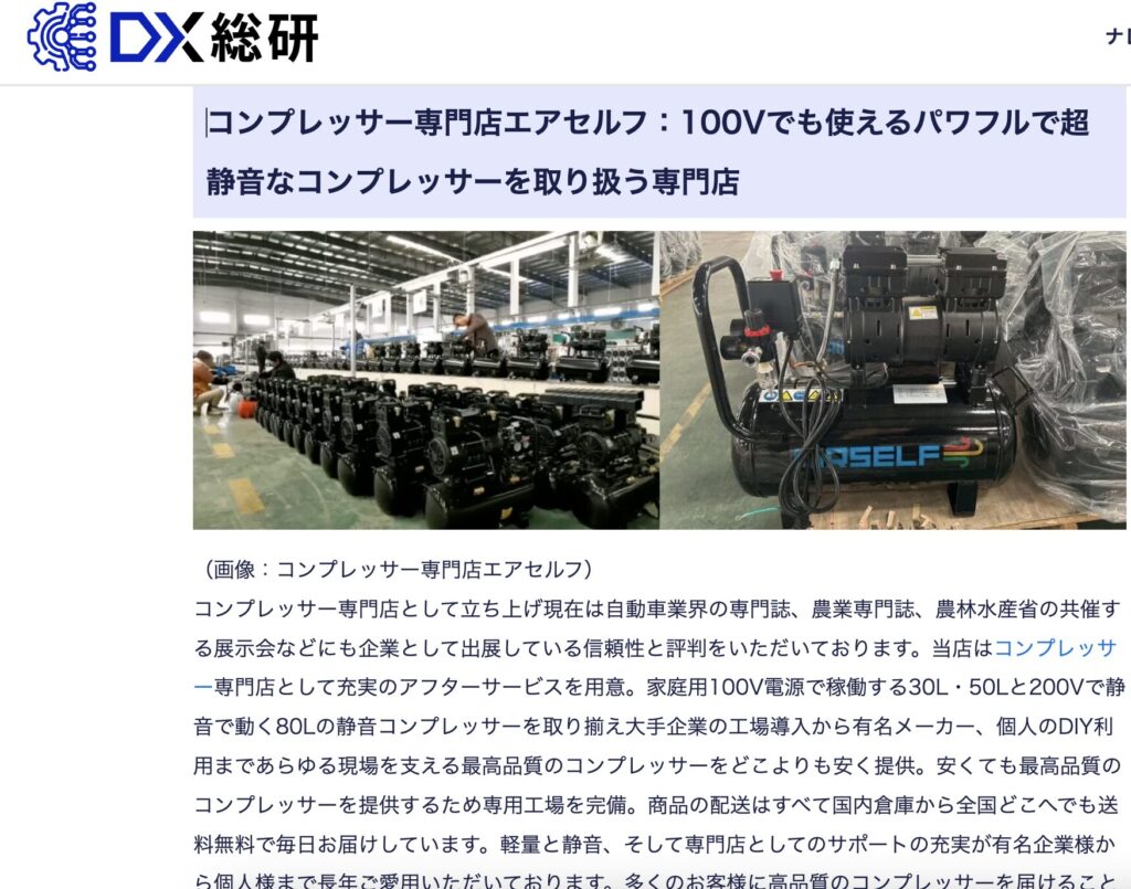 この度、弊社のコンプレッサーおよび実績と評判は、国内最大級のDIYや塗装アイテムを紹介するメディアでもあるDX総研(株式会社CREX運営)に紹介されました。