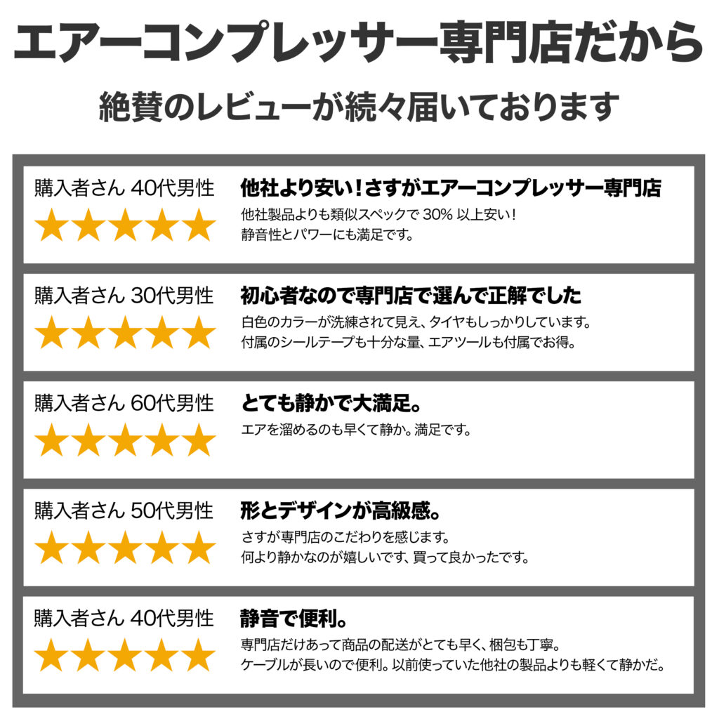 より良い商品を作ってお客様に届けるためにひとつずつ改善を重ね、現在、当サイトエアーコンプレッサー通販専門店エアセルフでは、本体のサイズ、持ち運びやすさ、静音性などの性能をさらに追求したエアーコンプレッサーの販売を行っています。