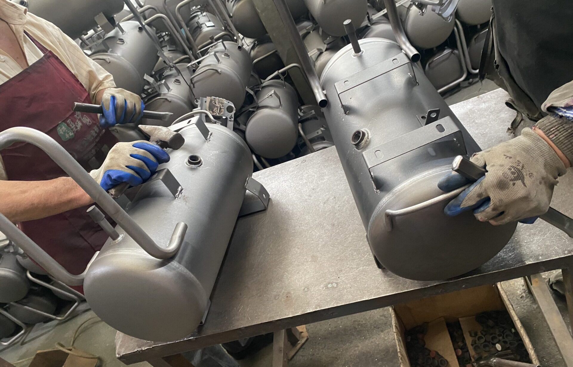 エアセルフは市場の成長と個人ユーザーの需要増加に応え、高性能でコストパフォーマンスに優れたエアーコンプレッサー製品を開発しています。そのため熟練の職人が手作業でありながら最新鋭の溶接ロボットも導入し安全性、耐久性、環境への配慮を実現したエアーコンプレッサーの製造に日々励んでおります。