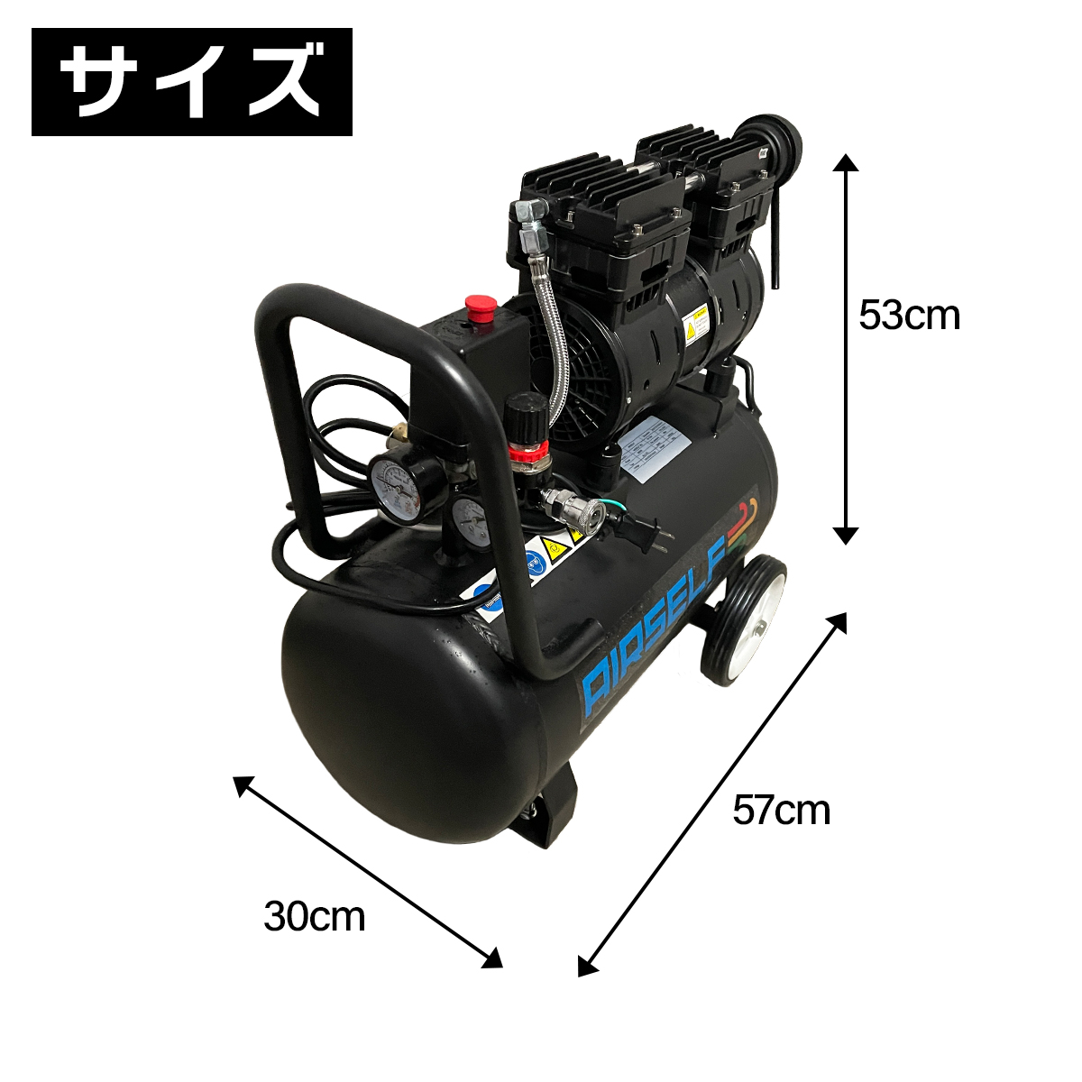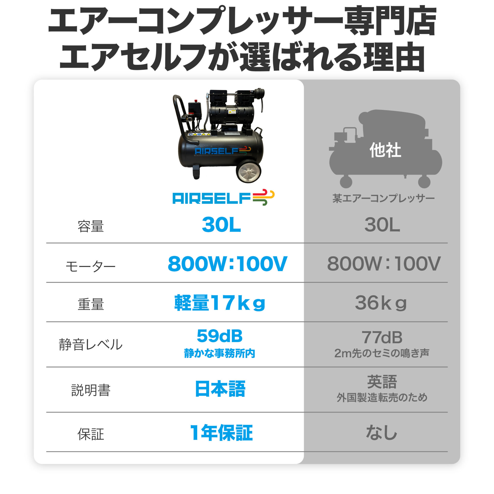 エアセルフ静音オイルレスコンプレッサー 軽量 アルミ製 30L 100V ブラック【長期1年保証】
