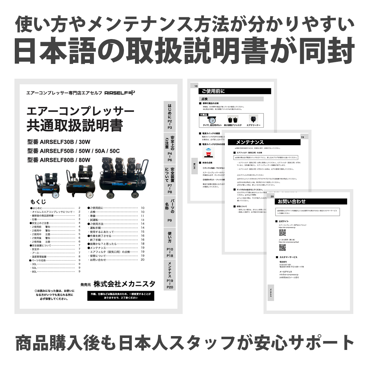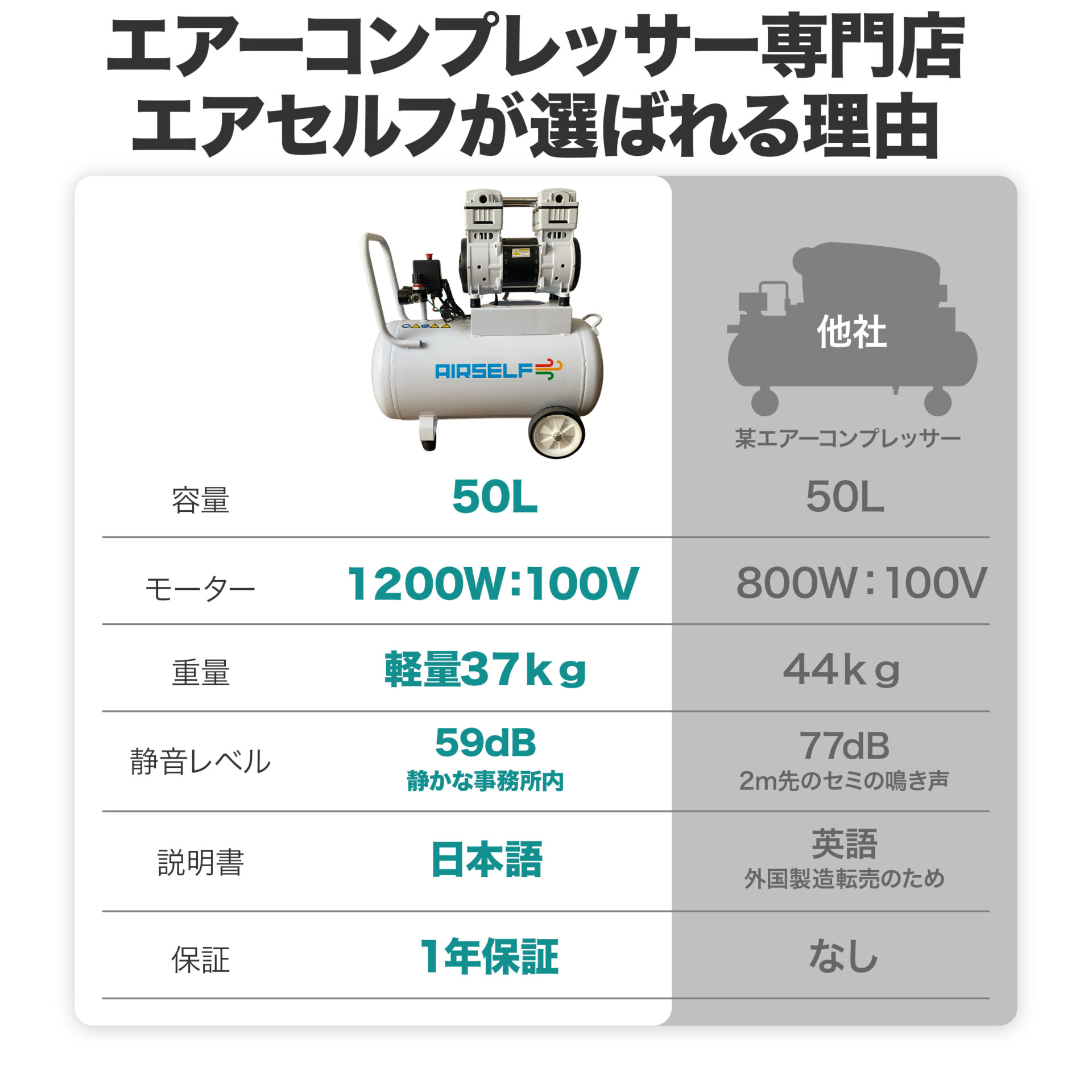 ・日本製の同スペックの静音エアーコンプレッサーと比較して3割前後もお求めやすい価格です。