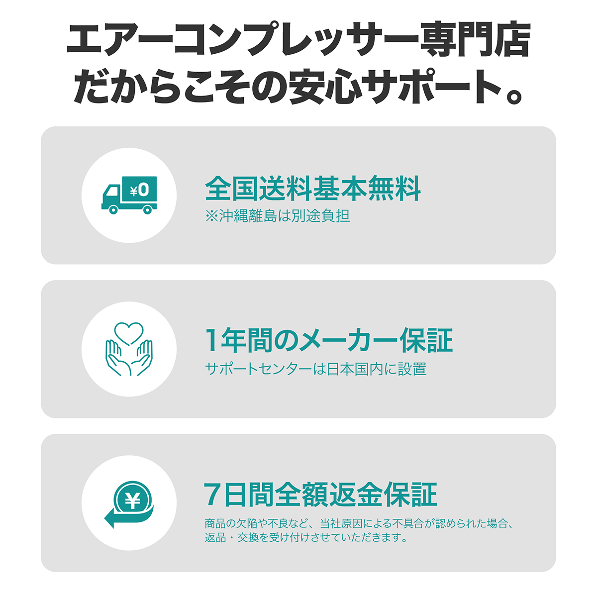 いずれもエアーコンプレッサー通販専門店のエアセルフでは専門店の安心追加保証「エアケア+forエアーコンプレッサー」なども完備しておりますが、無償のサポート他も充実したサポート体制を整えております。